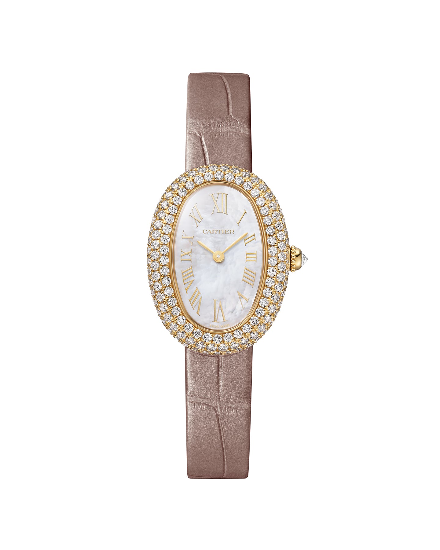 Baignoire watch, small model, quartz movement. 18K yellow gold (750/1000) case set with 227 brilliant-cut diamonds totaling 2.25 carats. 18K yellow gold (750/1000) beaded crown set with a brilliant-cut diamond totaling 0.08 carat. Mother-of-pearl dial, golden-finish steel sword-shaped hands, sapphire crystal. Semi-matte beige alligator leather strap, 18K yellow gold (750/1000) ardillon buckle. Length: 31.4, width: 23.1 mm, thickness: 6.9 mm. Water-resistant up to 3 bar (approx. 30 meters/100 feet).