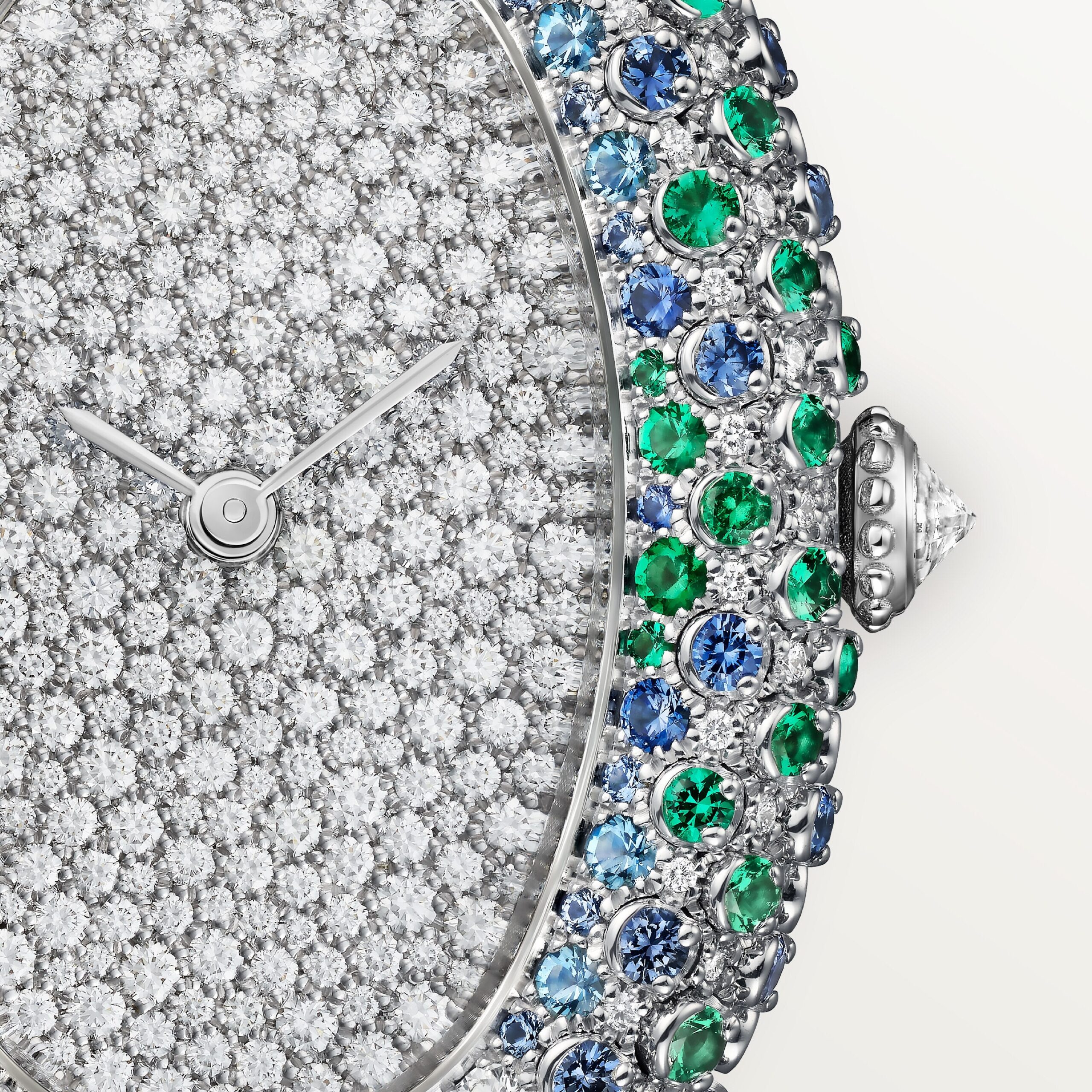 Baignoire watch, medium model, quartz movement. 18K white gold (750/1000) case set with 16 aquamarines, 58 sapphires totaling 0.75 carats, 54 emeralds totaling 0.62 carats and 170 brilliant-cut diamonds totaling 0.95 carats. Rhodium-finish 18K white gold (750/1000) beaded crown set with a brilliant-cut diamond totaling 0.14 carats. Dial set with 262 diamonds totaling 1.07 carats, rhodium-finish steel sword-shaped hands, sapphire crystal. Blue alligator leather strap, rhodium-finish 18K white gold (750/1000) ardillon buckle set with 21 diamonds totaling 0.21 carats. Length: 36 mm, width: 26 mm, thickness: 8.5 mm. Water-resistant up to 3 bar (approx. 30 meters/100 feet).