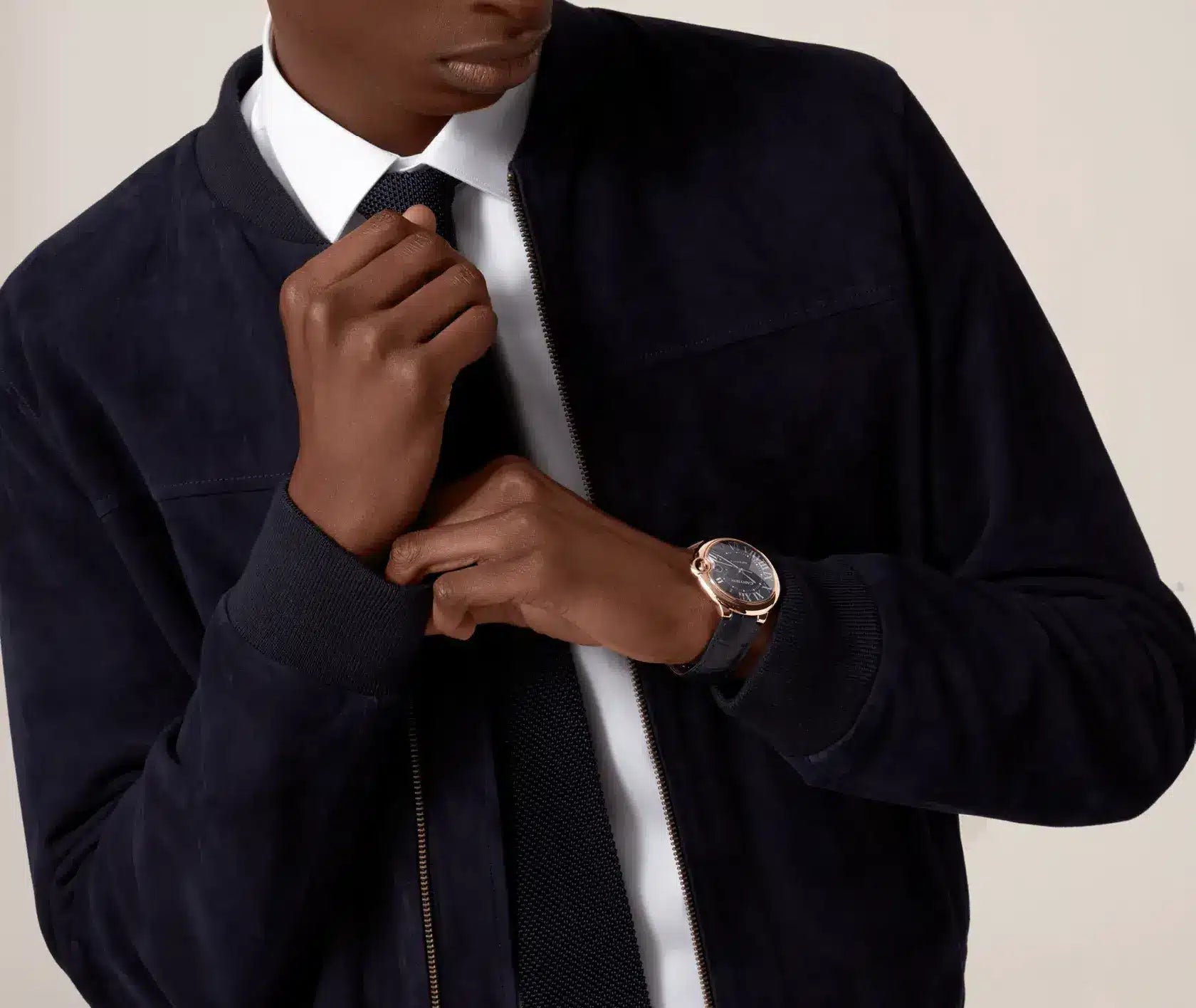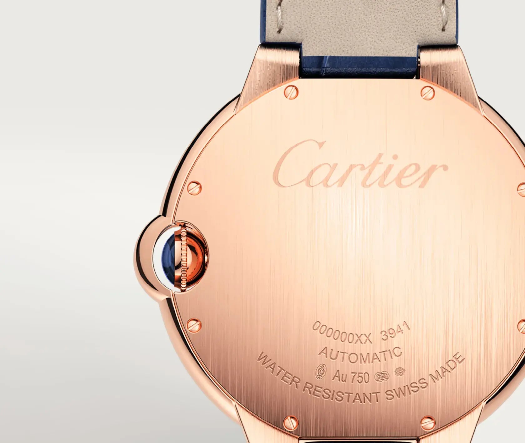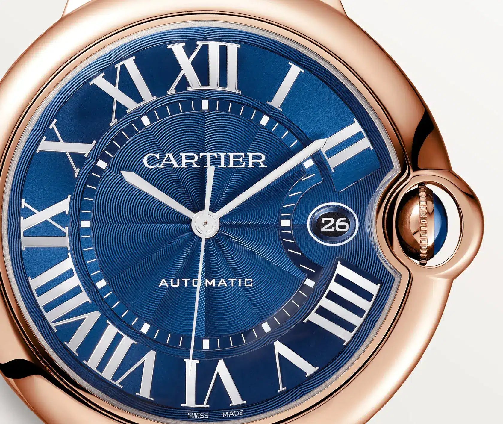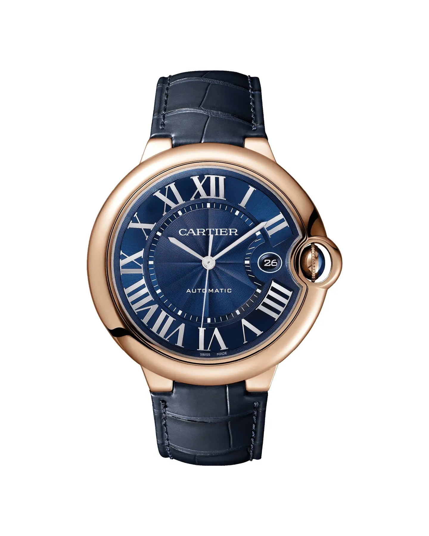 Ballon Bleu de Cartier watch, 42 mm. Mechanical movement with automatic winding, caliber 1847 MC. 18K rose gold (750/1000) case, fluted crown set with a cabochon sapphire, blue guilloché dial. Sword-shaped hands. Sapphire crystal. Navy blue alligator leather strap, 18K rose gold (750/1000) interchangeable deployant buckle. Calendar aperture at 3 o’clock. Thickness: 13 mm. Water-resistant up to 3 bar (approx. 30 meters/100 feet).