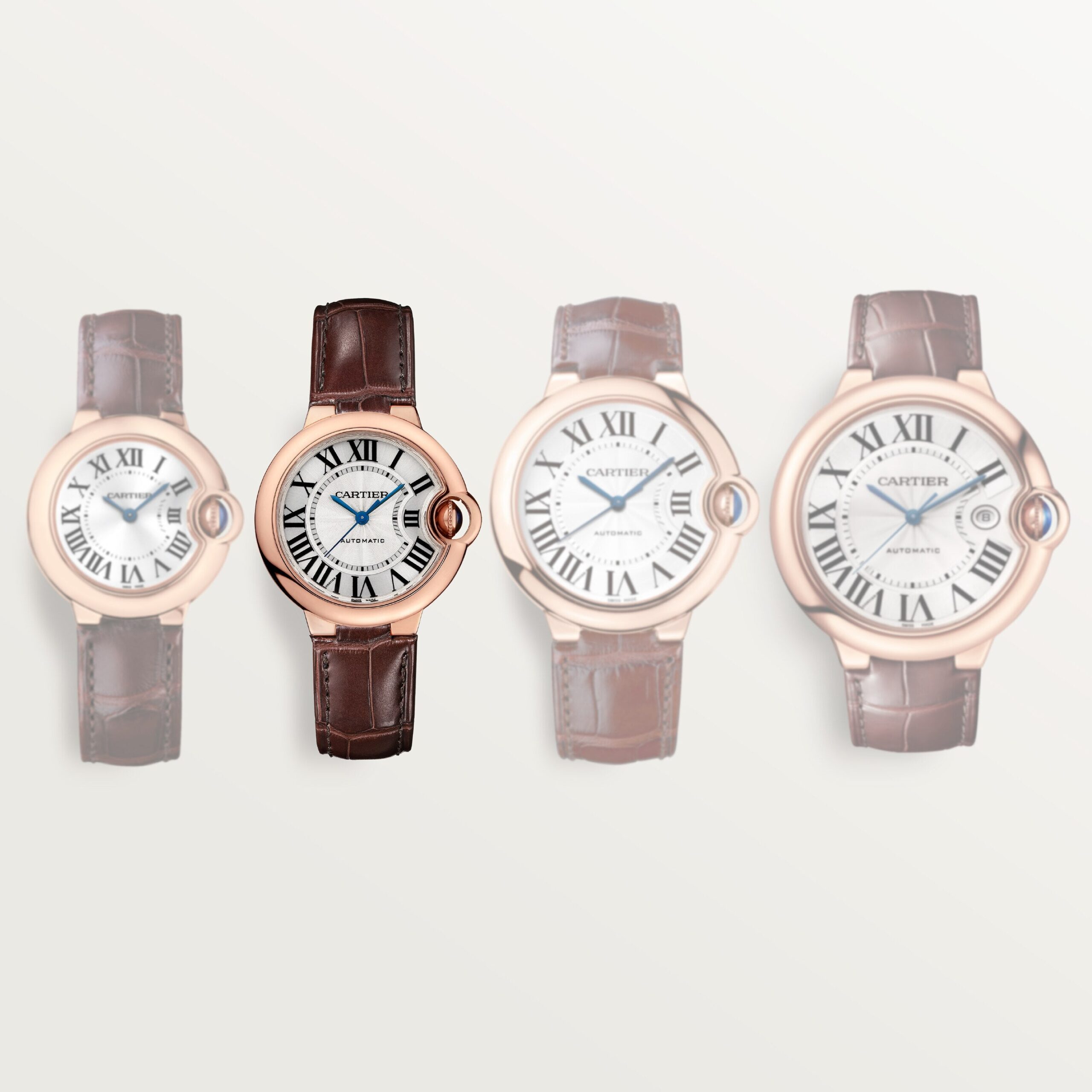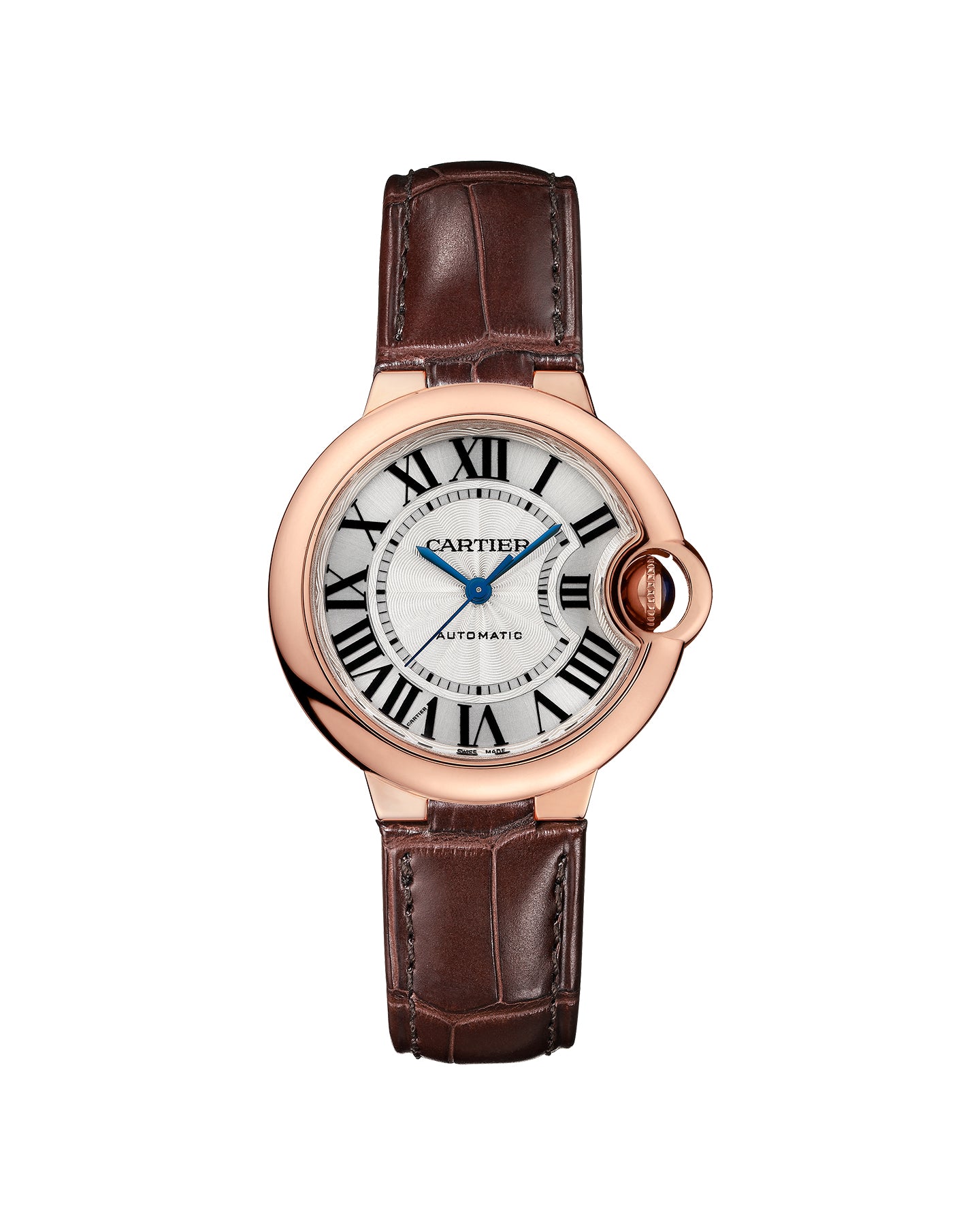 Ballon Bleu de Cartier watch, 33 mm, mechanical movement with automatic winding. Rose gold 750/1000 case, fluted crown set with a blue cabochon-shaped sapphire, silvered guilloché lacquered opaline dial, 12 Roman numerals, blued-steel sword-shaped hands, sapphire crystal, strap in alligator leather, rose gold 750/1000 ardillon buckle. Case dimensions: diameter: 33 mm, thickness: 10.16 mm. Water-resistant up to 3 bar (approx. 30 meters/100 feet).