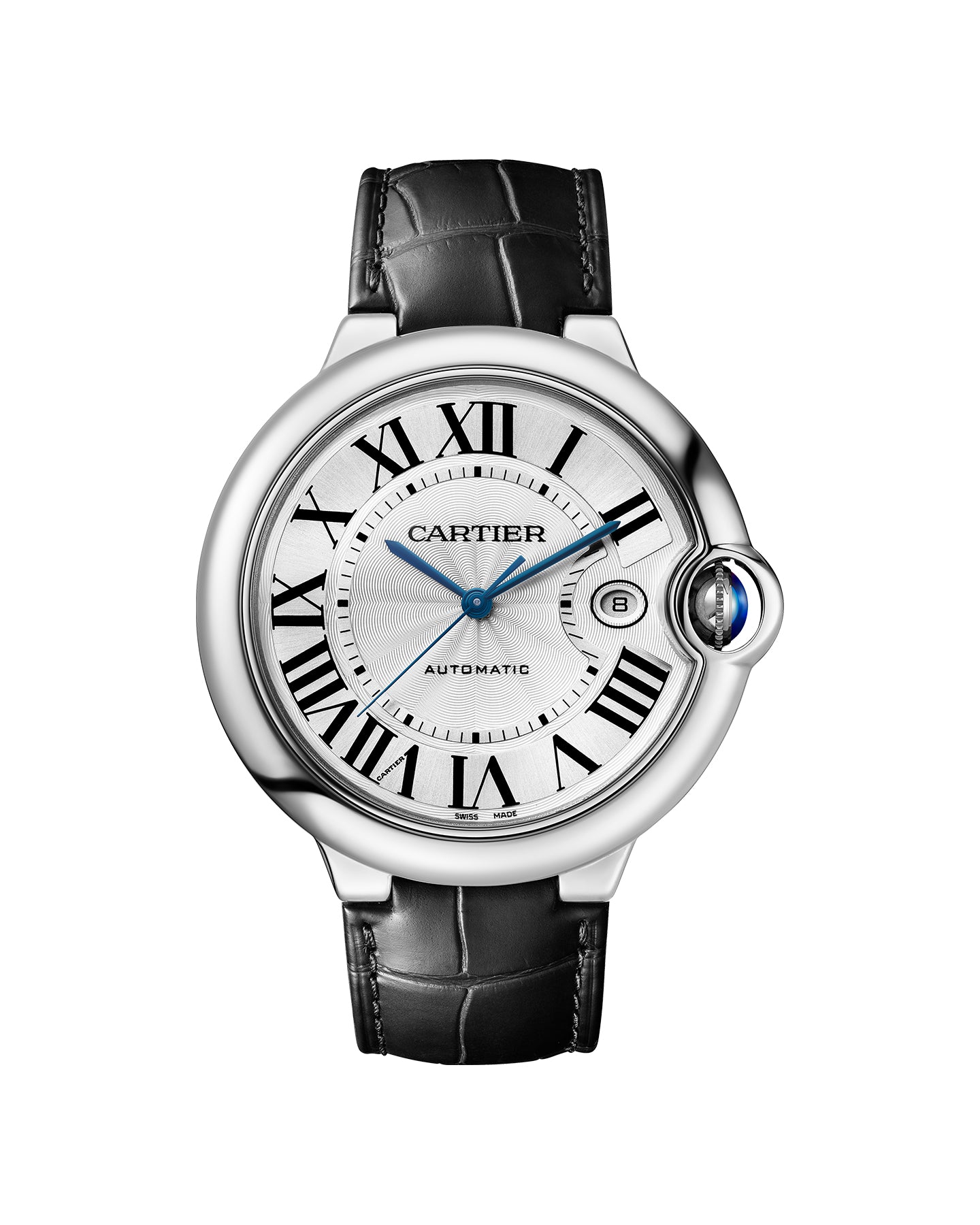 Ballon Bleu de Cartier watch, 42 mm. Mechanical movement with automatic winding, caliber 1847 MC. Steel case, fluted crown set with a cabochon synthetic spinel, silver guilloché opaline dial. Blued-steel sword-shaped hands, sapphire crystal, black alligator leather strap, steel interchangeable deployant buckle. Calendar aperture at 3 o’clock. Thickness: 13 mm. Water-resistant up to 3 bar (approx. 30 meters/100 feet).
