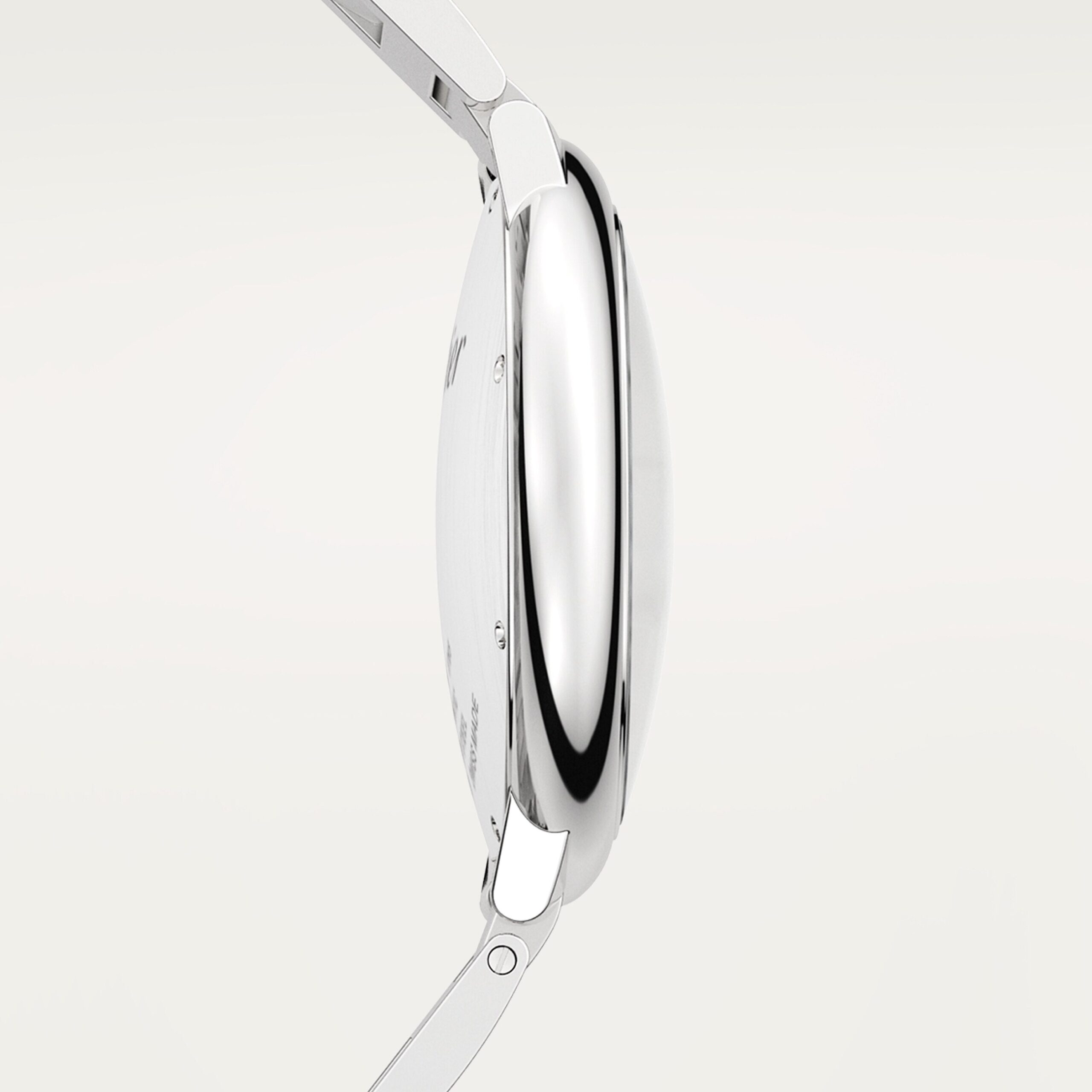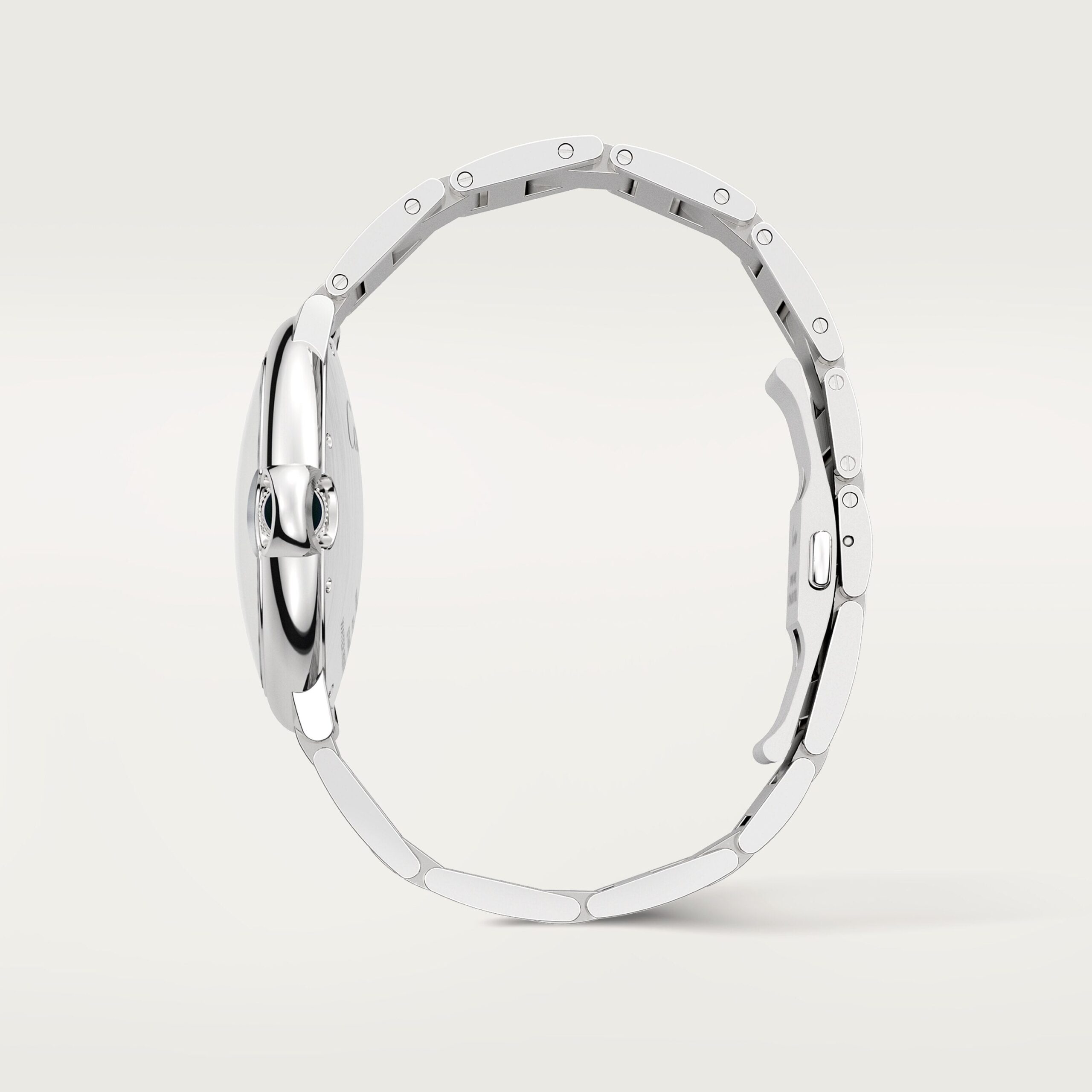 Ballon Bleu de Cartier watch, 42 mm. Mechanical movement with automatic winding, caliber 1847 MC. Steel case, fluted crown set with a cabochon synthetic spinel. Silver guilloché dial. Blued-steel sword-shaped hands. Sapphire crystal. Calendar aperture at 3 o’clock. Steel interchangeable bracelet. Case thickness: 13 mm. Water-resistant up to 3 bar (approx. 30 meters/100 feet).