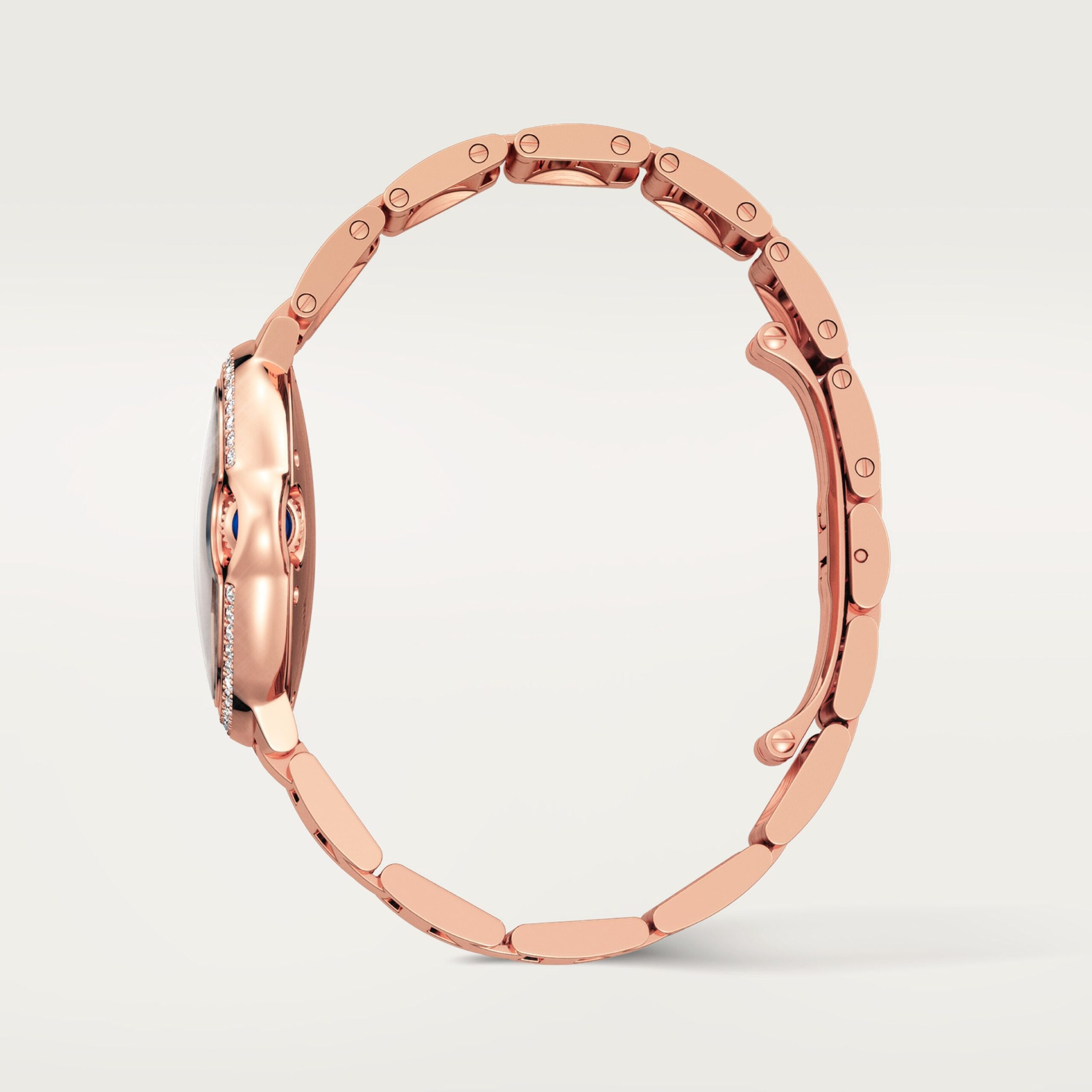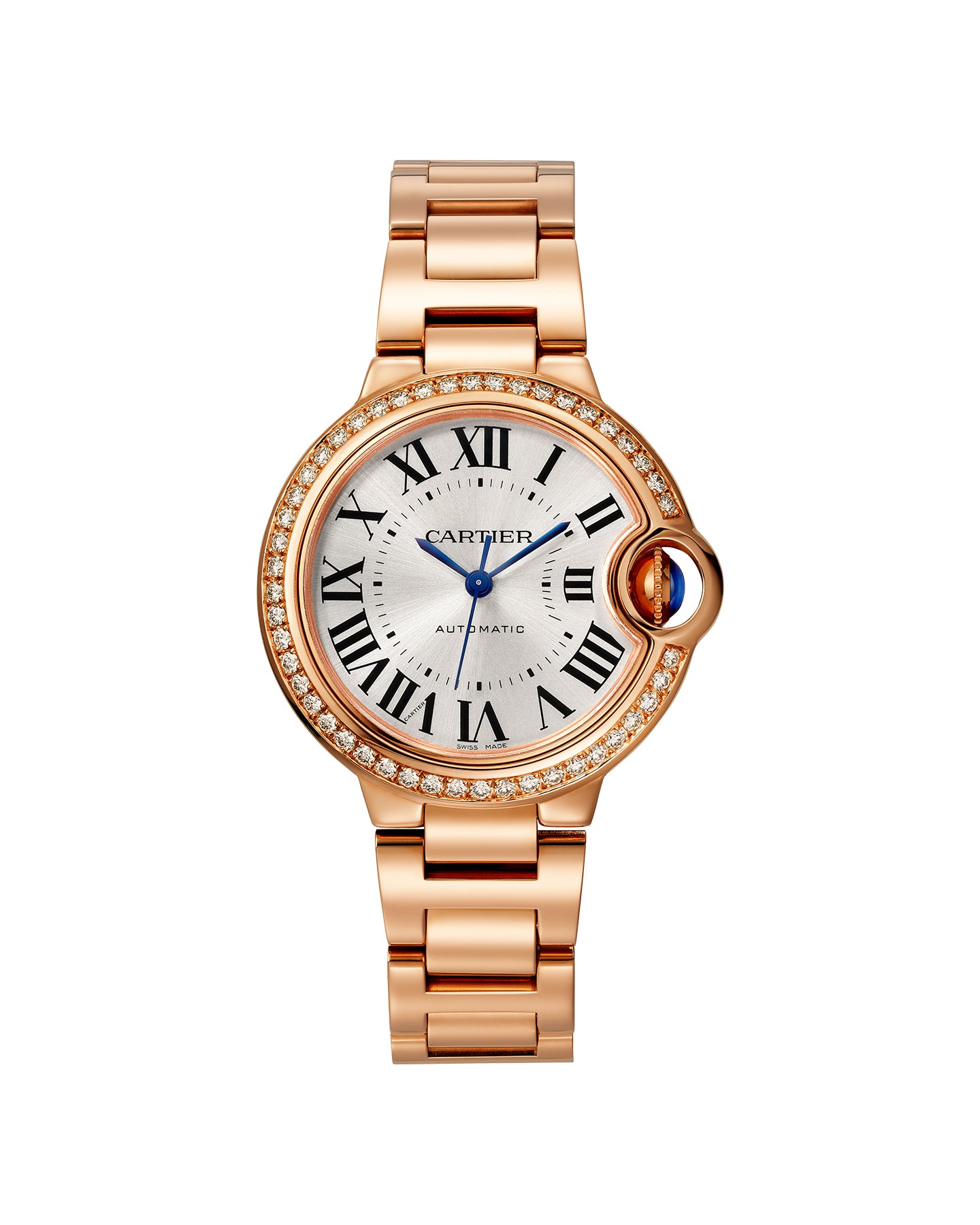 Ballon Bleu de Cartier watch, 33 mm, mechanical movement with automatic winding. Rose gold 750/1000 case set with 47 brilliant-cut diamonds totaling 0.68 carat. Fluted crown set with a cabochon sapphire. Silver dial with sunray-effect. Blued-steel sword-shaped hands. Sapphire crystal. Rose gold 750/1000 interchangeable bracelet. Thickness: 10.16 mm. Water-resistant up to 3 bar (approx. 30 meters/100 feet).