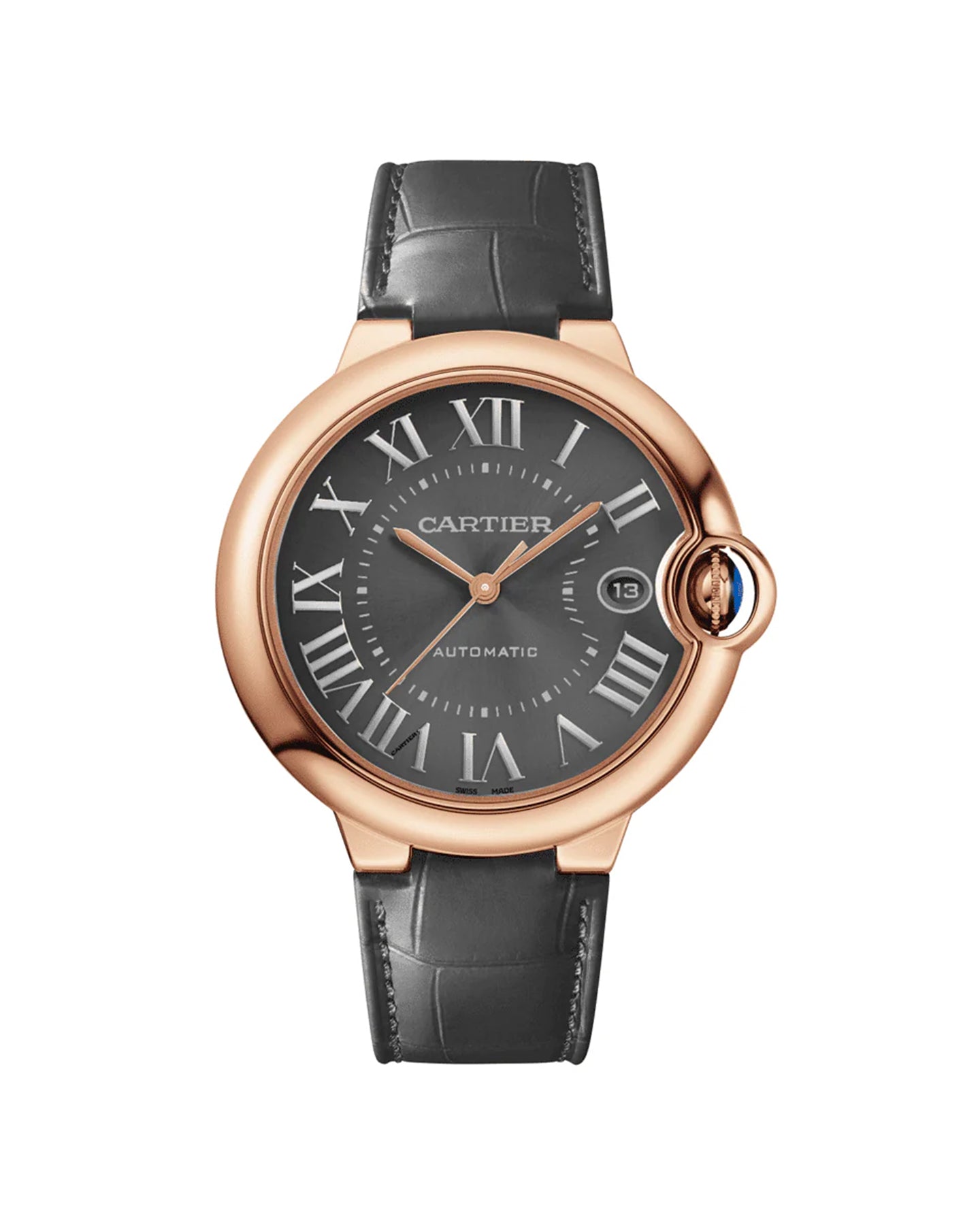 Ballon Bleu de Cartier watch, 40 mm, mechanical movement with automatic winding, calibre 1847 MC. 18K rose gold case, fluted crown set with a sapphire cabochon, dark grey sunray-brushed dial, 18K rose gold sword-shaped hands, sapphire crystal, interchangeable grey alligator-skin strap, interchangeable 18K rose gold folding buckle, calendar aperture at 3 o’clock. Thickness: 12.4 mm. Water-resistant to 3 bar (approx. 30 metres).