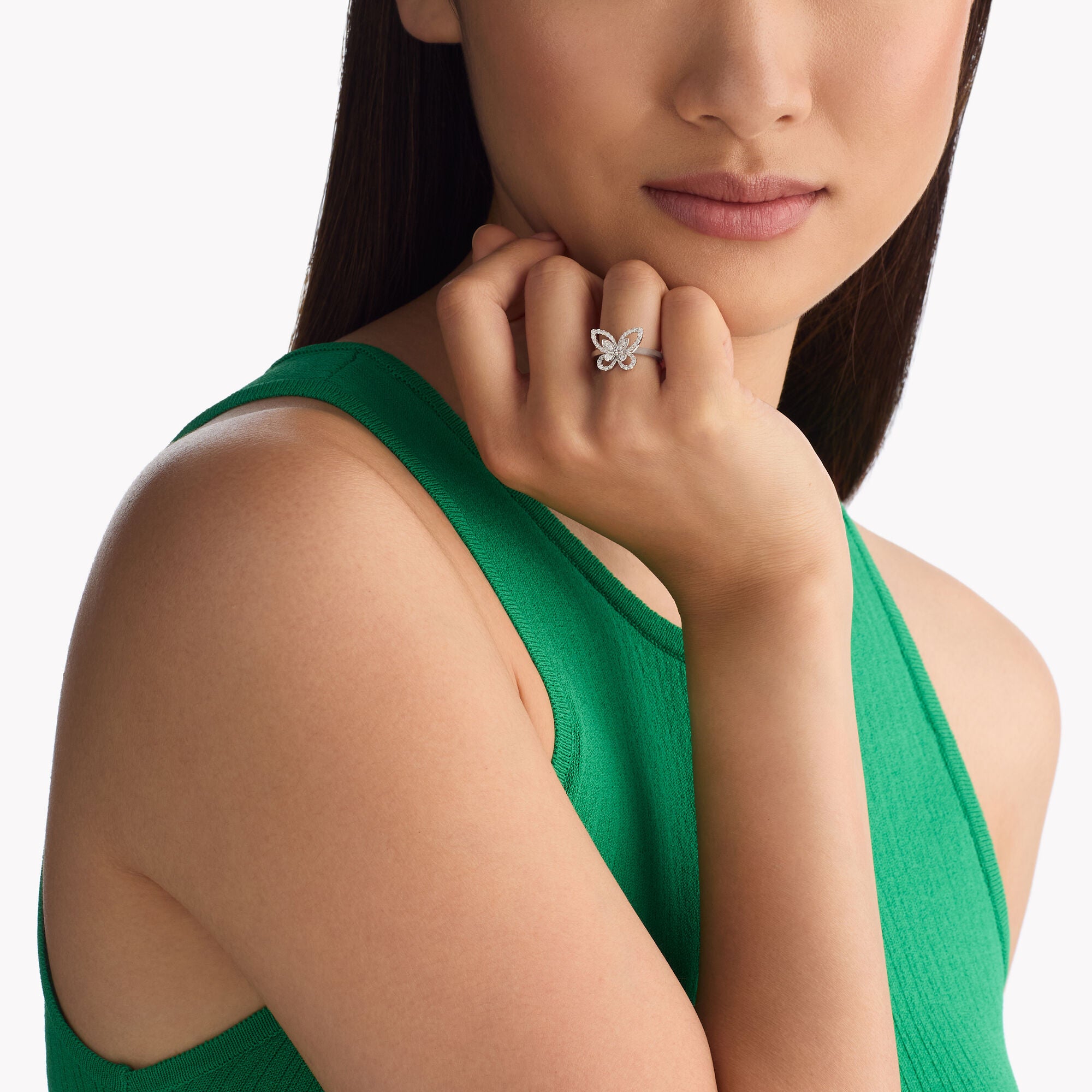 A petite and perfectly proportioned expression of our signature Butterfly motif, the Butterfly Silhouette Mini ring in white gold features two layers of butterfly wings crafted from pavé diamonds, gently angled to capture a subtle sense of three-dimensionality and movement. Pavé diamonds trace the outline of this endlessly captivating creature, with the openwork design capturing the gossamer-light delicacy of a butterfly’s wings. The exquisite femininity of the iconic Graff Butterfly motif is beautifully rendered in the Butterfly Silhouette collection, which also includes diamond studs, pendants and earrings.