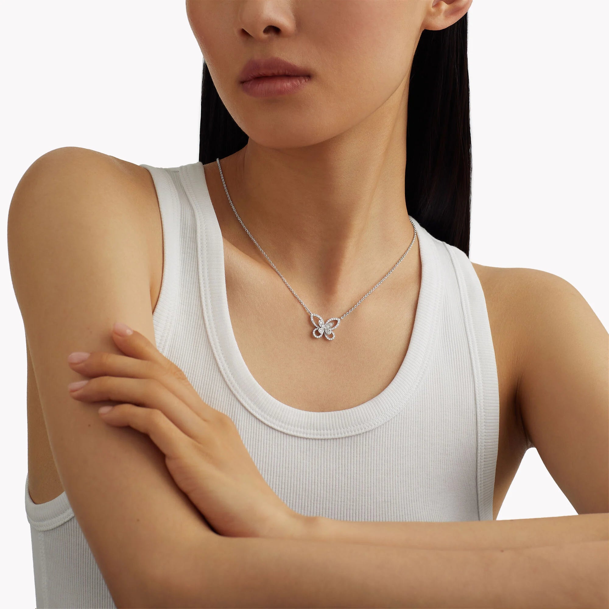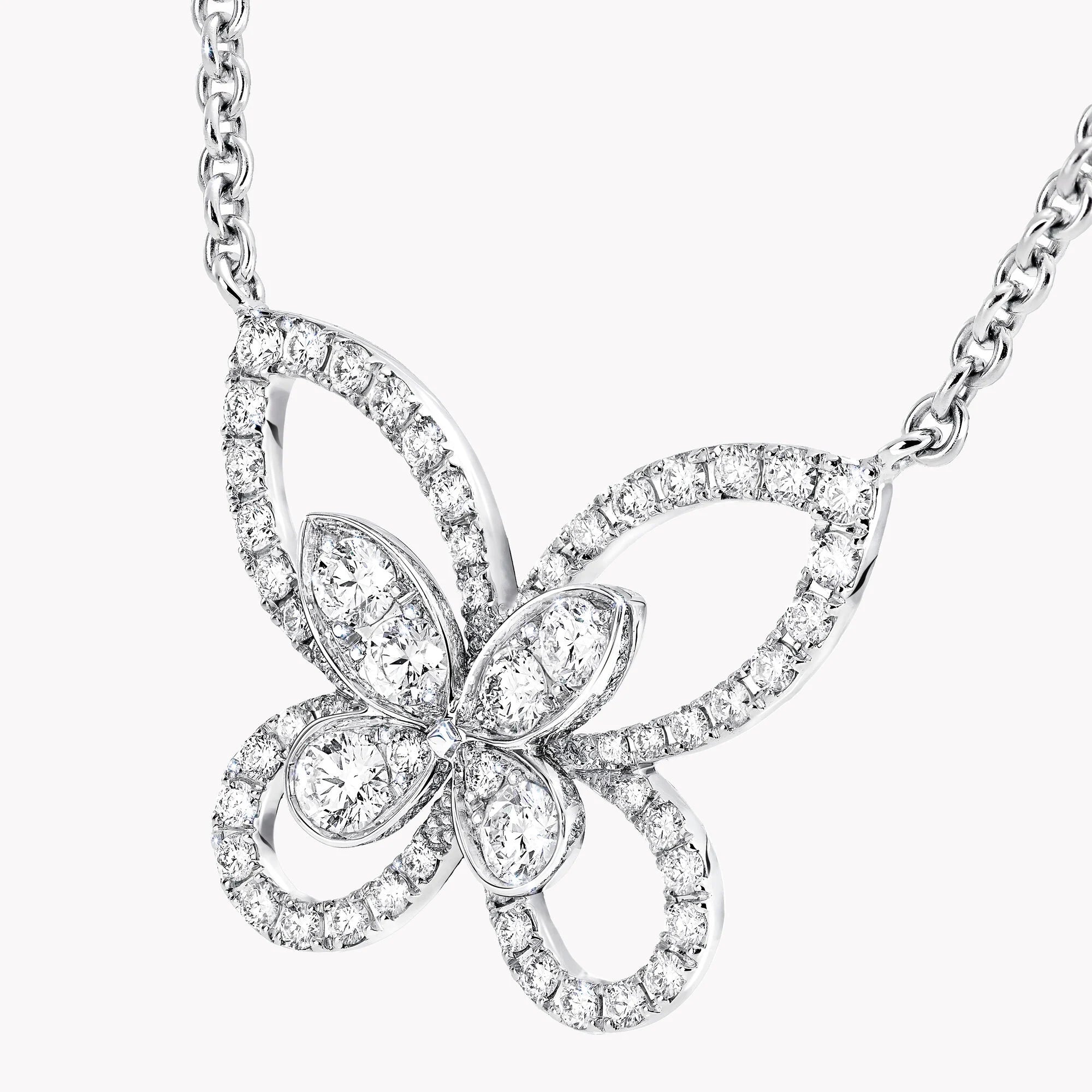 A celebration of a butterfly’s effortlessly feminine silhouette, our elegant Butterfly Silhouette pendant traces the outline of each wing in scintillating pavé diamonds, with clusters of pavé stones forming a second butterfly silhouette in the centre. Presented on a white gold chain, the double-layer design brings a subtle sense of three-dimensionality to the piece. Butterflies have played a prominent role in the history of the House. An enduring source of inspiration for our designers, the Butterfly Silhouette collection is the latest to feature the iconic Graff Butterfly motif.