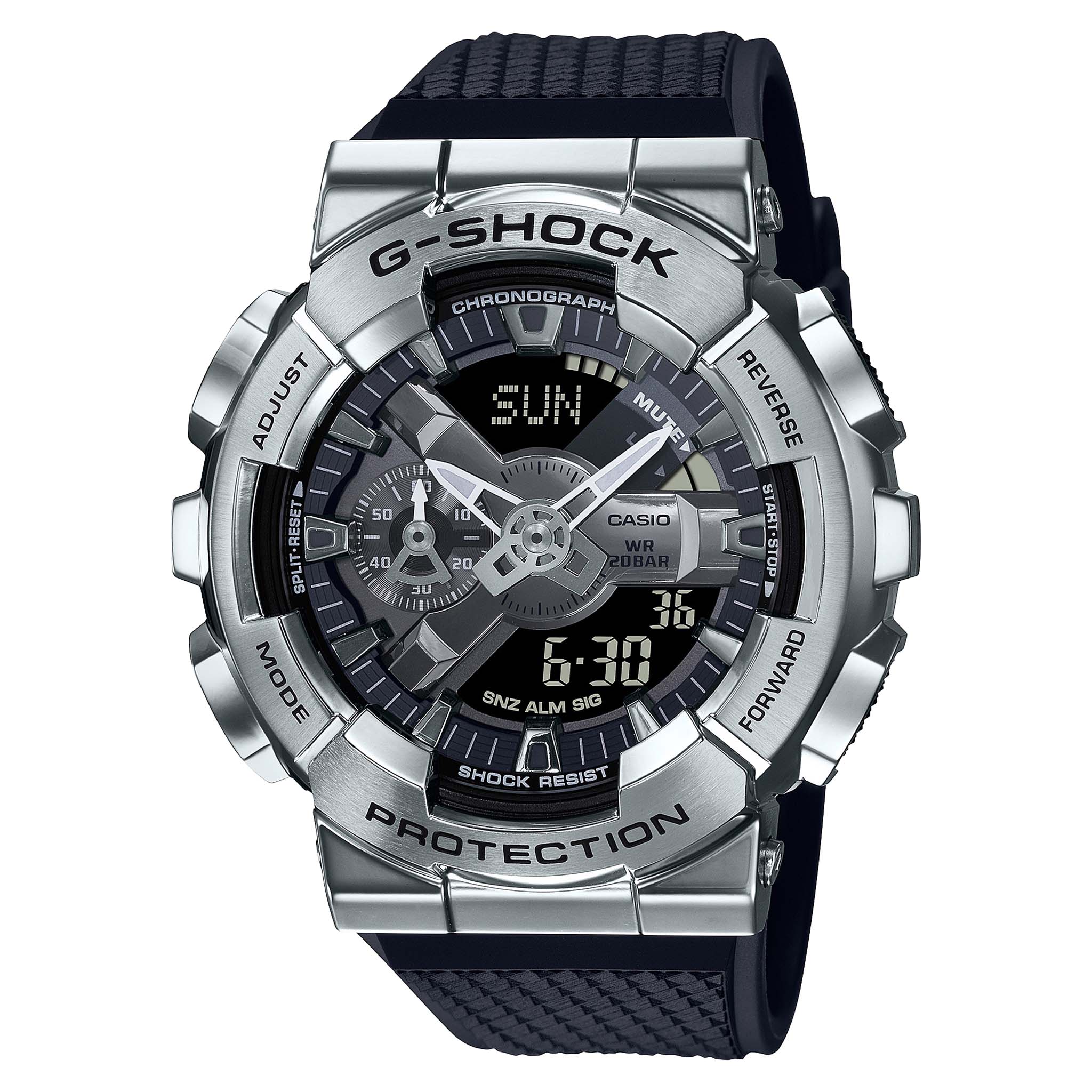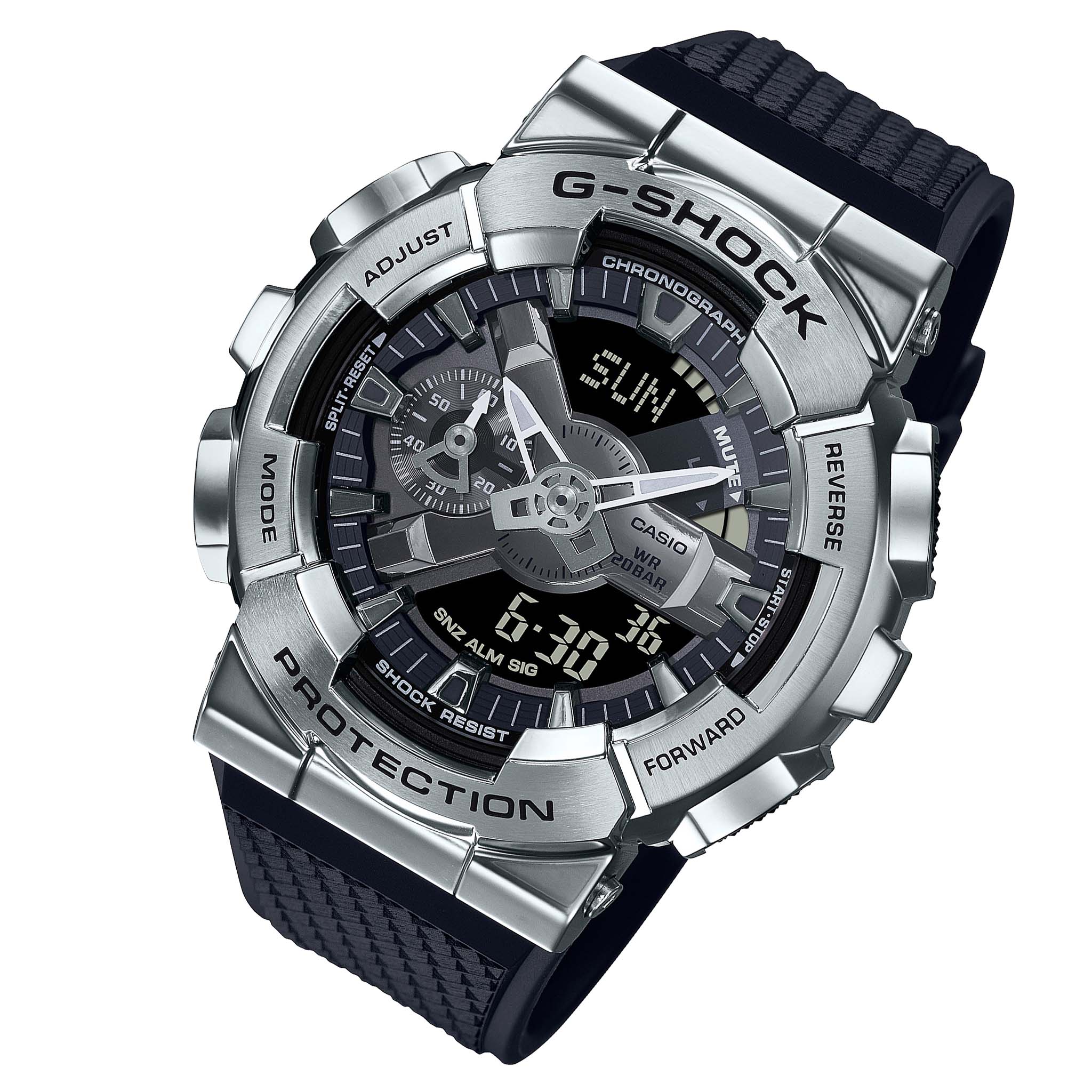 The stainless steel bezel of this analog-digital GM-110 Series model has been forged, cut and polished to give it its distinctive design.