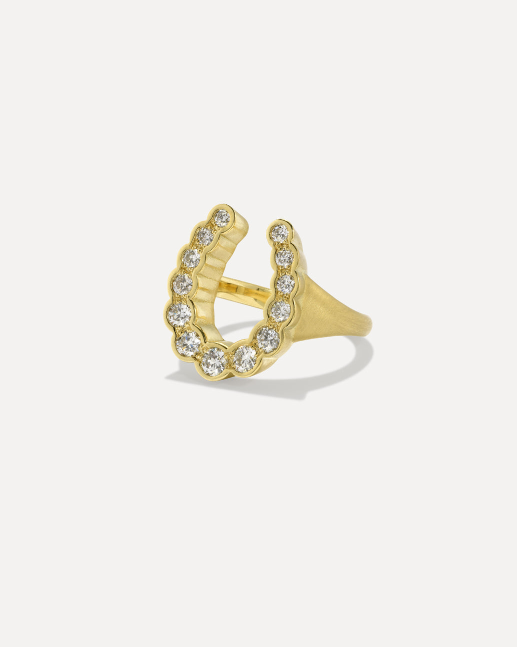 From the Equestrian Collection, a beautiful 18k yellow gold horseshoe ring bezel set with dazzling full-cut diamonds.