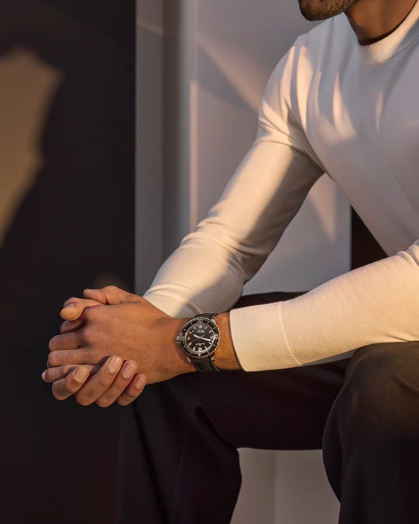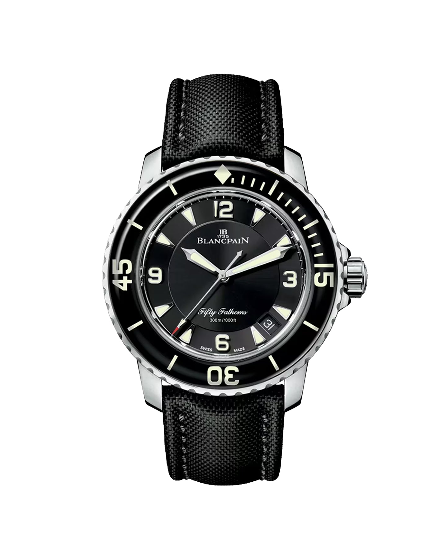Model number: 5015 1130 52B. Fifty Fathoms Automatique, automatic, Calibre 1315 (with silicon balance-spring and secured movement), 120-hour (5-day) power reserve; black dial; 45.00 mm steel case, 15.50 mm thick; water resistance to 30 bar (300 m); unidirectional bezel; sail-canvas (rubber-lined) with folding clasp.
