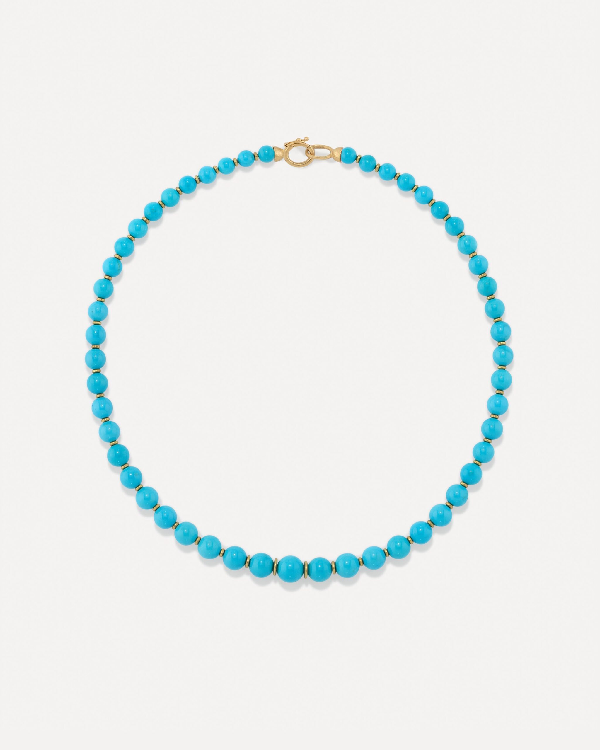 From the Beaded Candy Collection, a graduated version of your favorite childhood necklace set with an assortment Kingman turquoise spheres separated by 18k yellow gold beads and finished on an 18k yellow gold clasp.