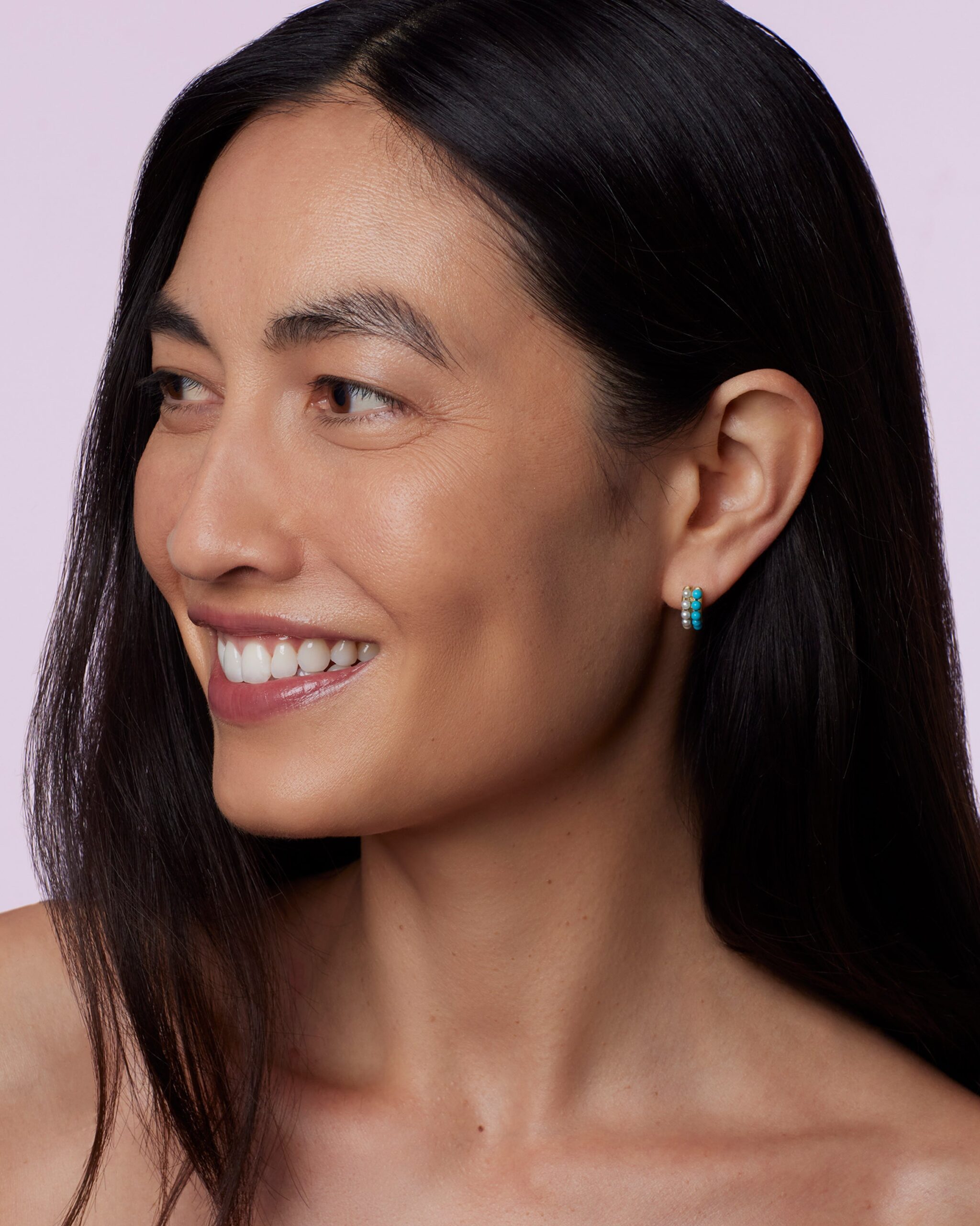 From the Gumball Collection, a pair of 18k yellow gold double hoops set with rows of Akoya pearl and turquoise.