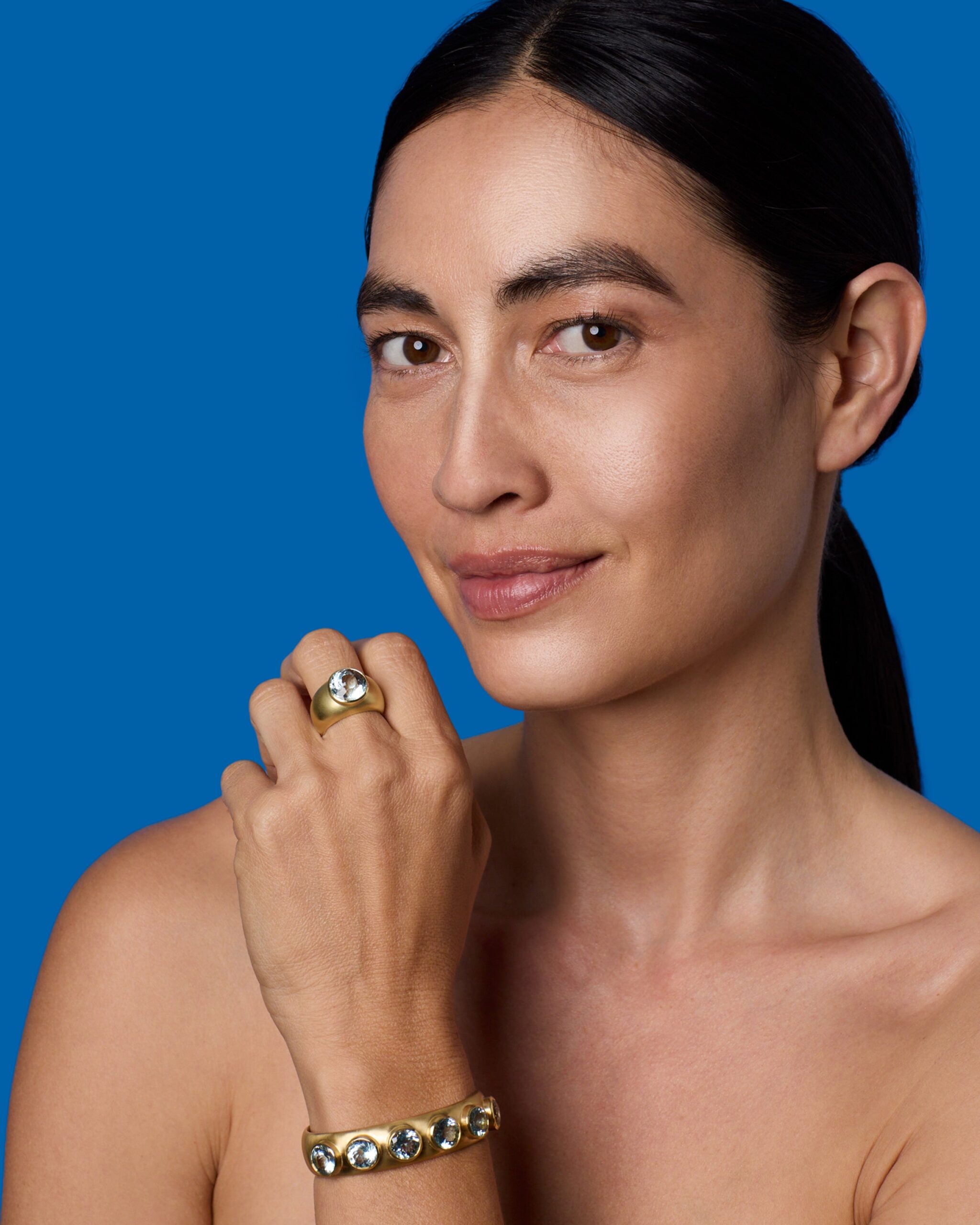 From the Puffed Gold Collection, an 18k yellow gold puffed band, bezel set with a large, round aquamarine.