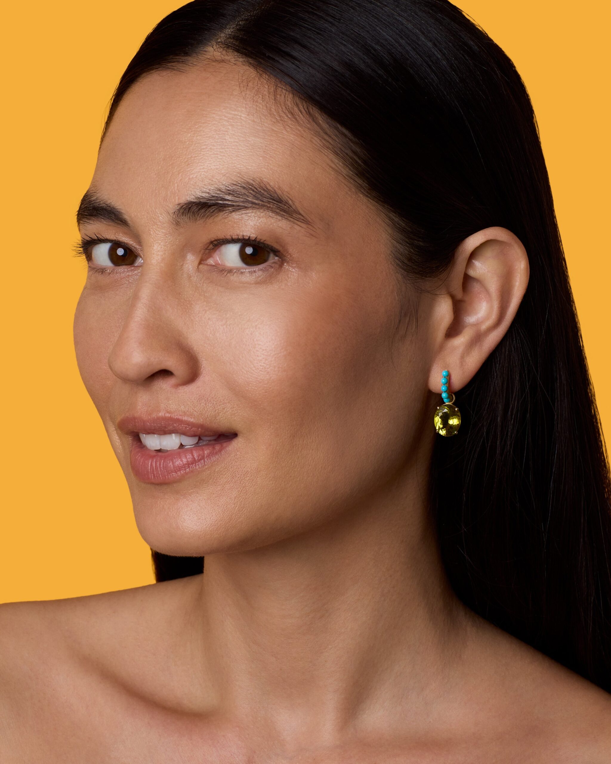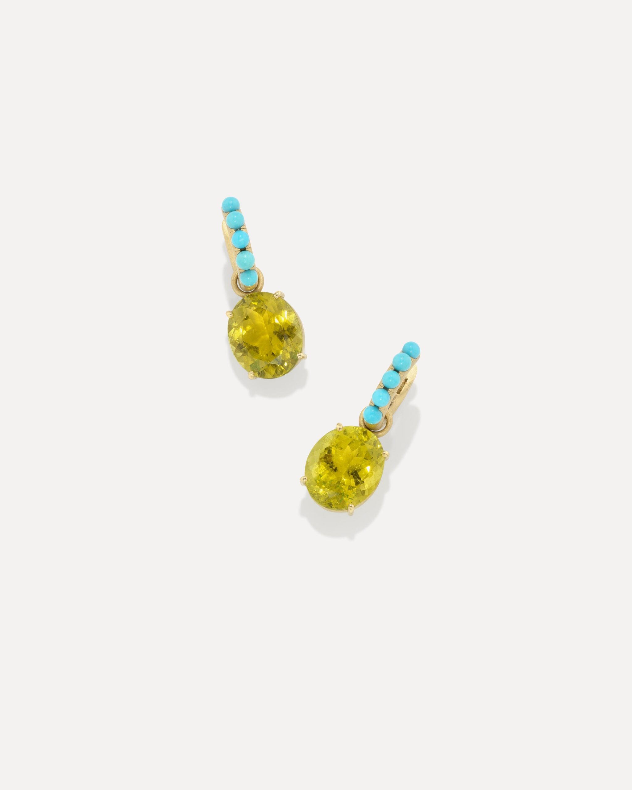 From the Gem Drop Collection, a one of a kind pair of 18k yellow gold earrings set with dazzling tourmalines, adorned by turquoise gumball hoops.