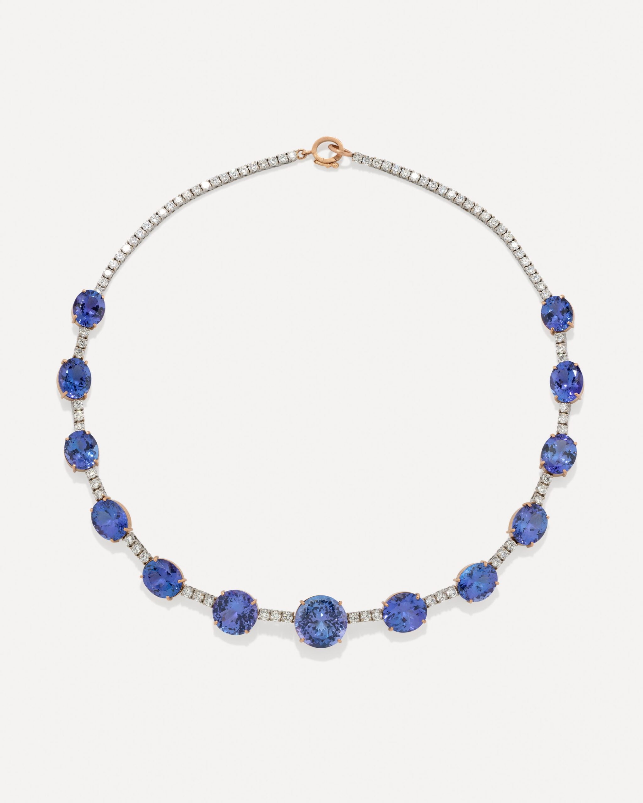 From the Gemmy Gem Collection, a one of a kind 18k rose and white gold tennis necklace set with thirteen mixed shape tanzanites and full cut diamonds.