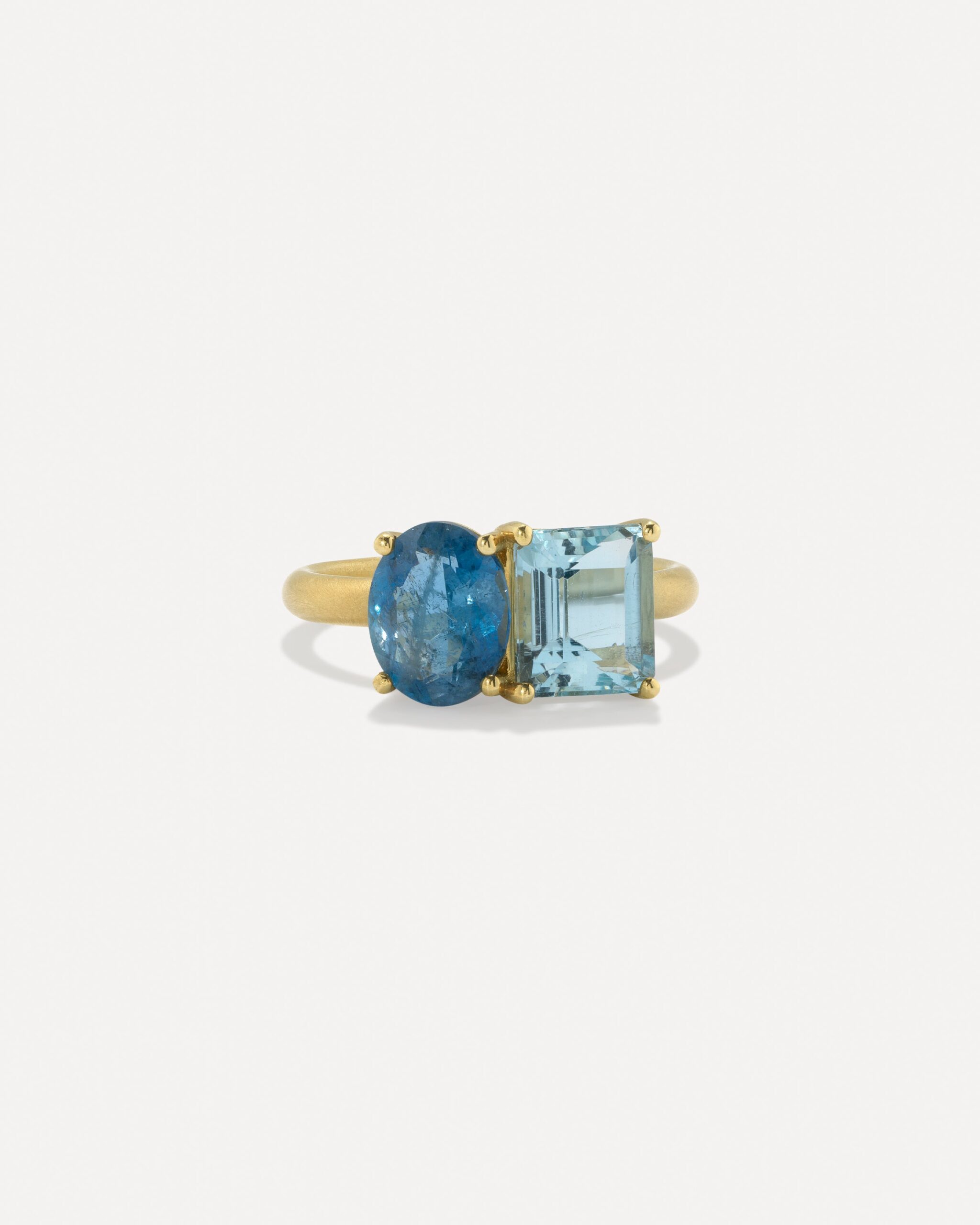 From the Double Stone Ring Collection, a one of a kind 18k yellow gold ring set with varying shades of aquamarines.