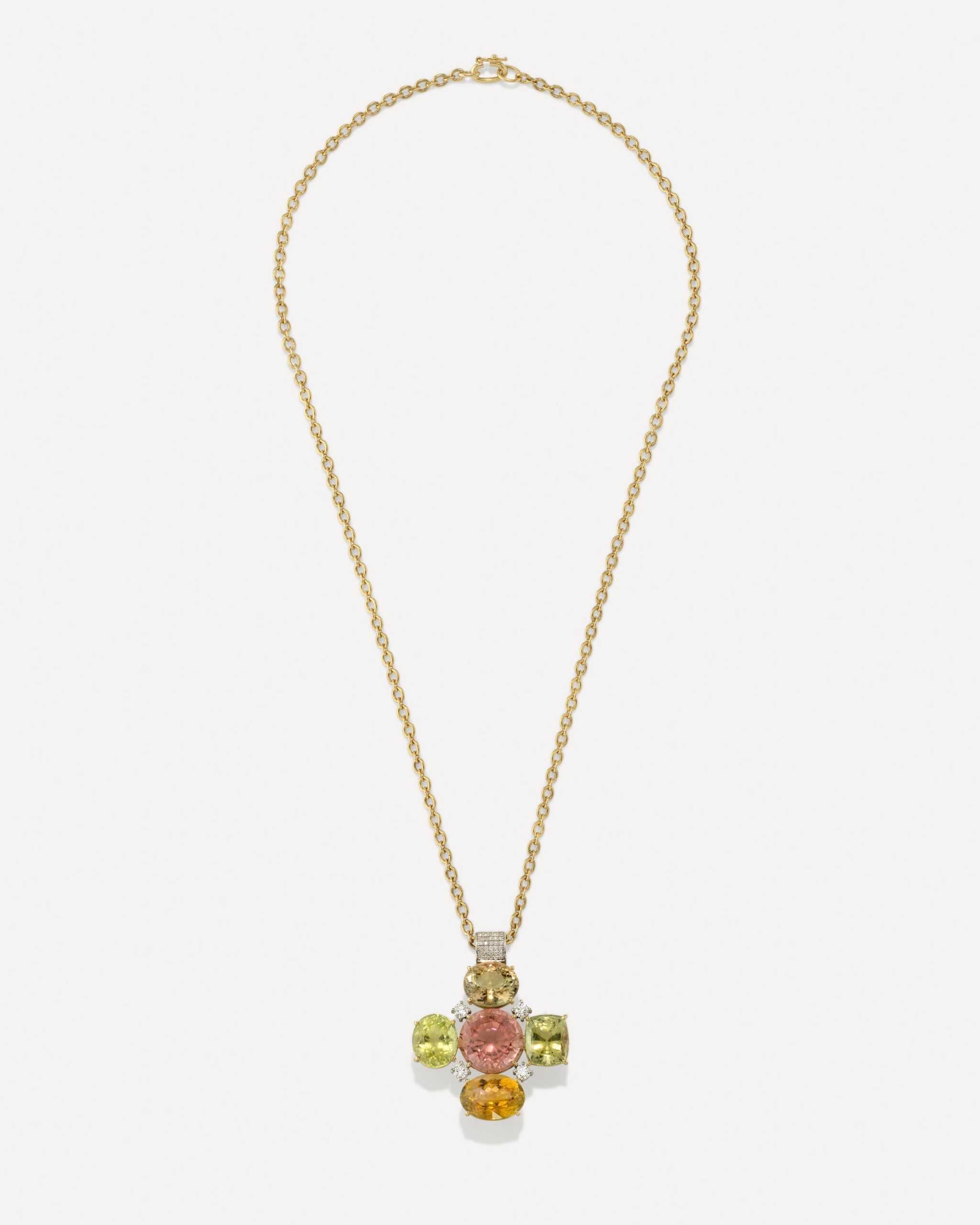 From the Gemmy Gem Collection,  a one of a kind 18k yellow and white gold necklace set on a heavy pavé diamond bale accented with varying shades of tourmalines and full cut diamonds, finished on our Signature Oval Link Chain.