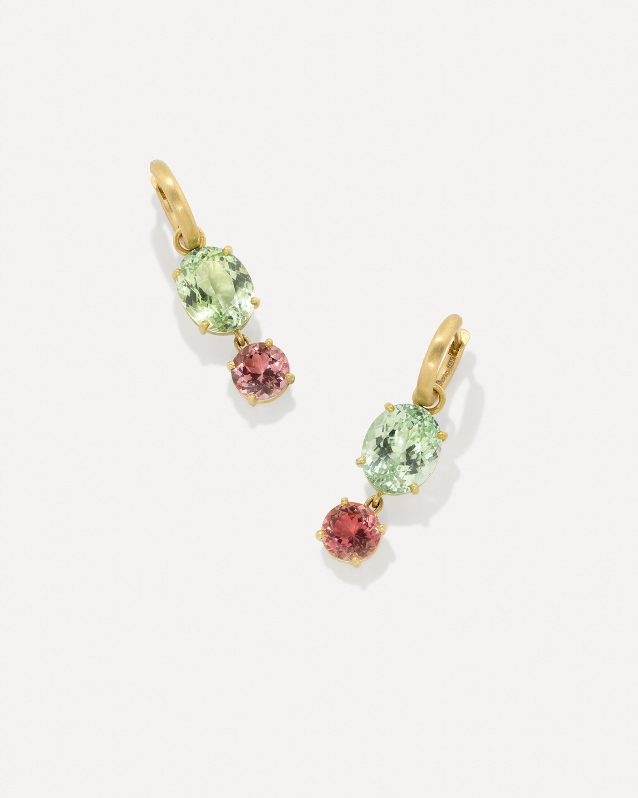 From the Gemmy Gem Collection, a one of a kind pair of earrings set with an assortment of green and pink tourmalines, finished on 18k yellow gold hoops.