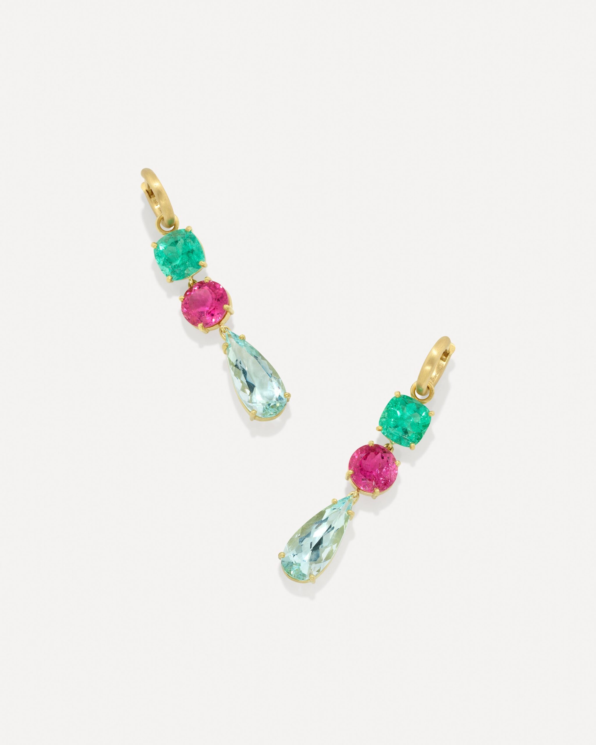 From the Gemmy Gem Collection, a pair of one of a kind earrings set with a stunning assortment of emeralds, rubellites, and aquamarines stacked in 18k yellow gold, and finished on 18k yellow gold hoops.