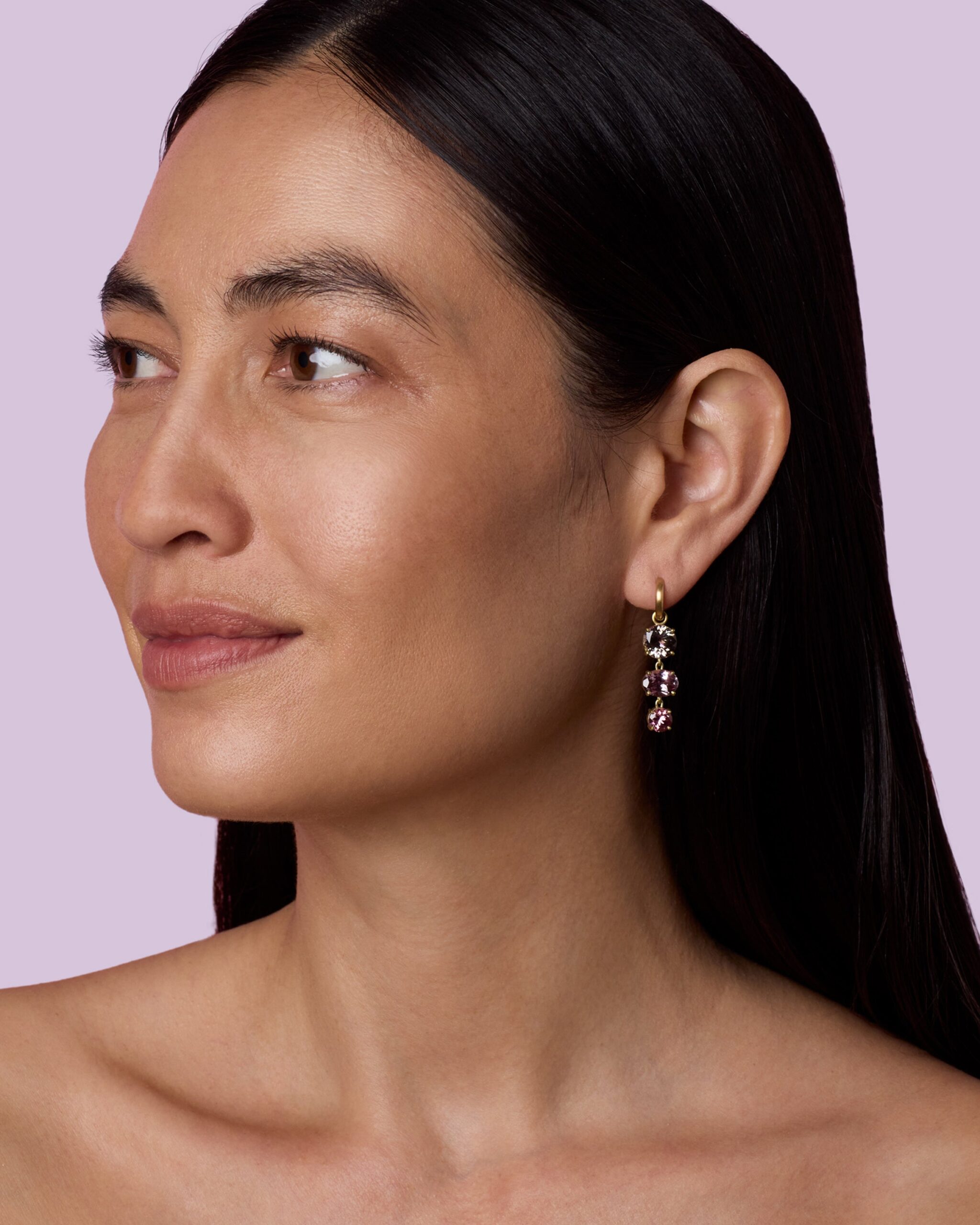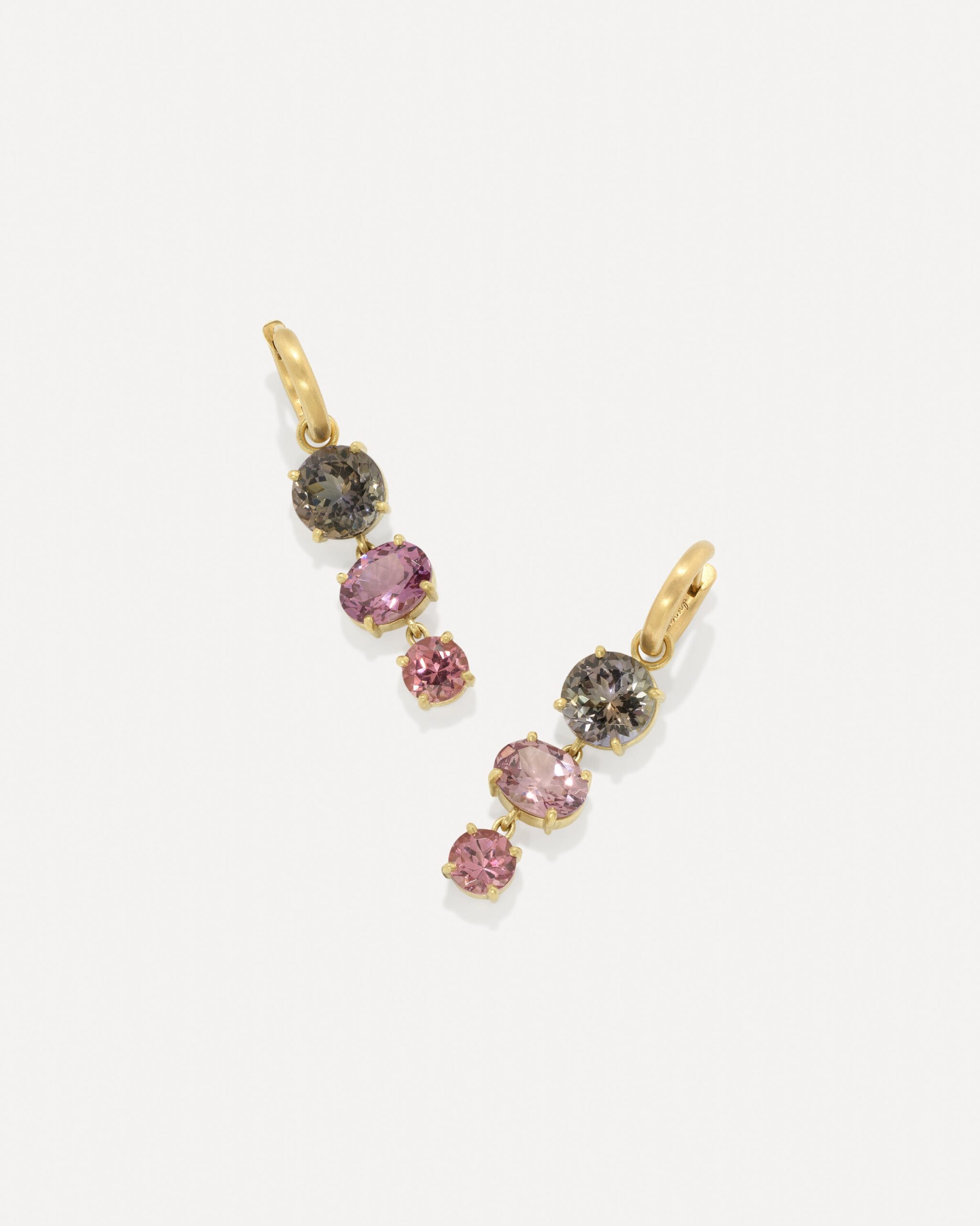 From the Gemmy Gem Collection, a pair of one of a kind earrings set with a beautiful assortment of tanzanites and garnets stacked in 18k yellow gold, finished on 18k yellow gold hoops.