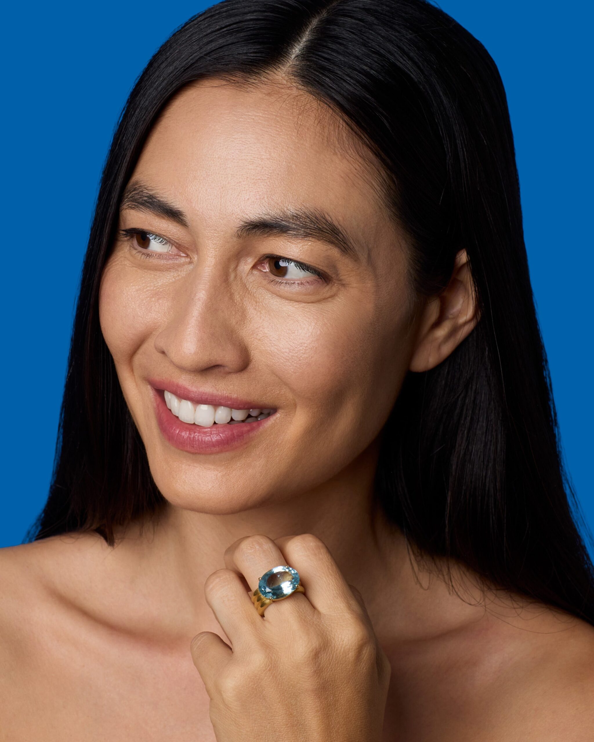 From the Heroic Collection, a one of a kind ring, prong set with an oval aquamarine, set in three rows of 18k yellow gold.