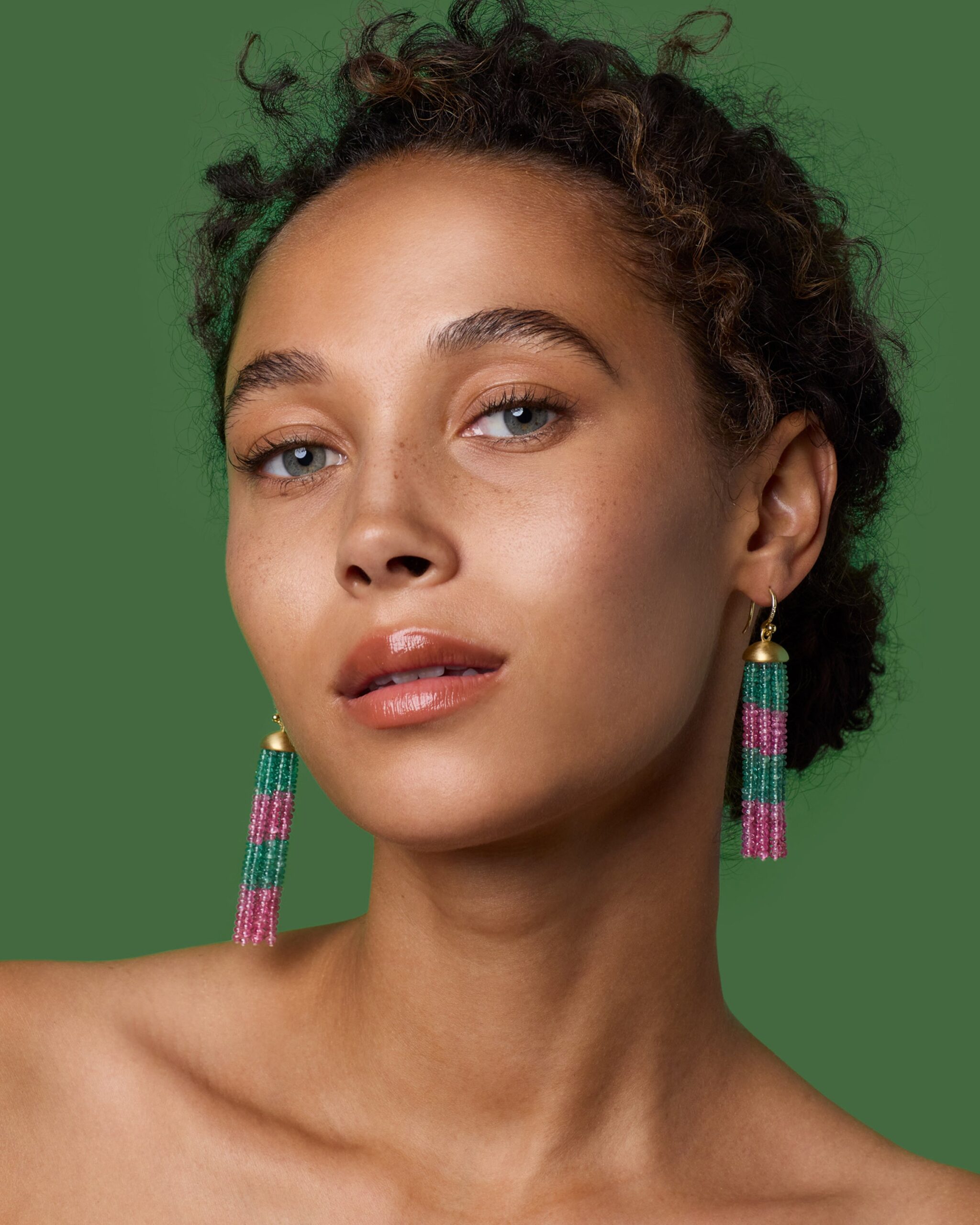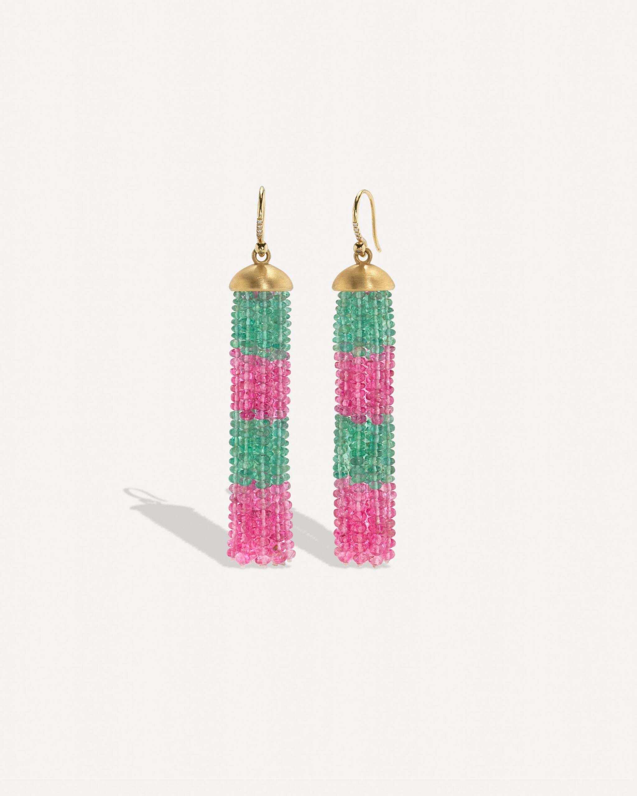 From the Tassel Collection, a one of a kind pair of 18k yellow gold earrings strung with a beautiful assortment of emerald and spinel beads.