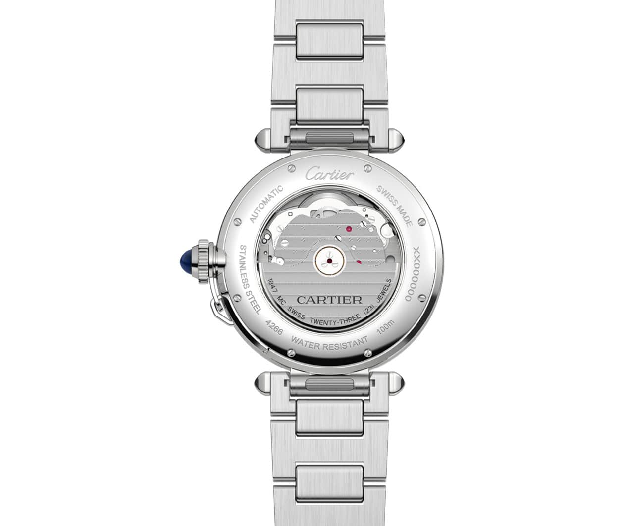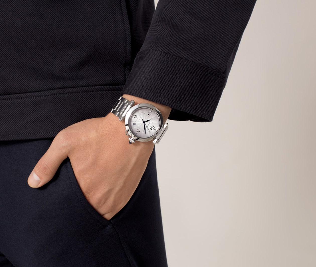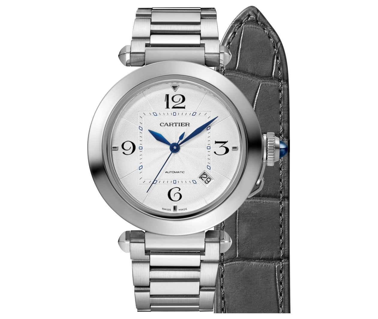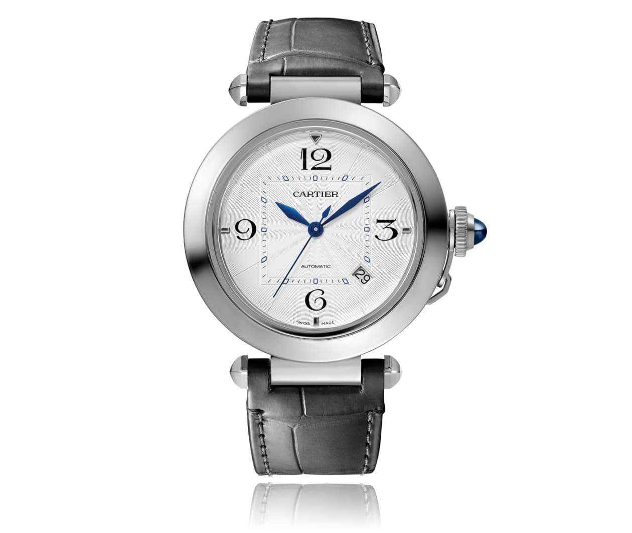 Pasha de Cartier watch, 41 mm, mechanical movement with automatic winding, calibre 1847 MC. Steel case, fluted crown cap and crown set with synthetic spinels, silvered flinqué dial, blued-steel diamond-shaped hands, steel bracelet with “SmartLink” adjustment system, second dark grey alligator-skin strap, interchangeable steel folding buckle. Both are fitted with the “QuickSwitch” interchangeable system. Case diameter: 41 mm, thickness: 9.55 mm. Water-resistant to 10 bar (approx. 100 metres).