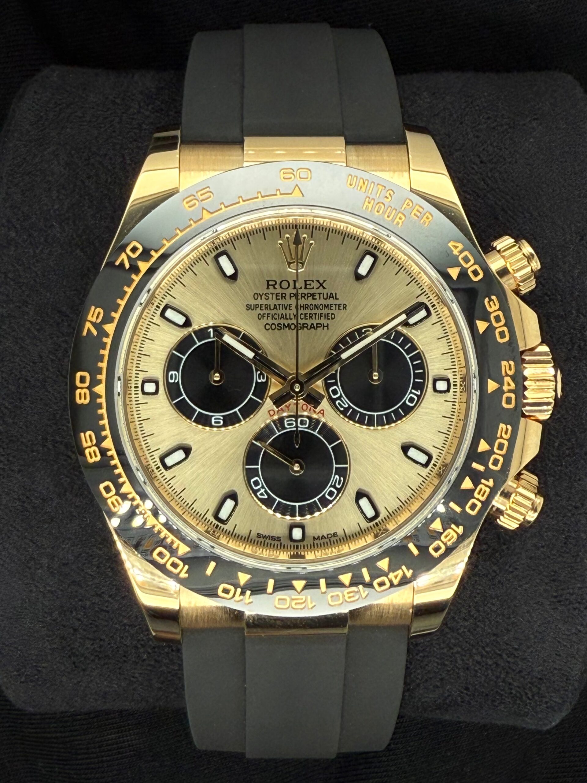 The Rolex Daytona is the ultimate chronograph, designed for those who demand precision and style. With its 40mm case, available in Oystersteel, 18ct yellow gold, 18ct white gold, 18ct everose gold or platinum, the Daytona combines luxury with performance.